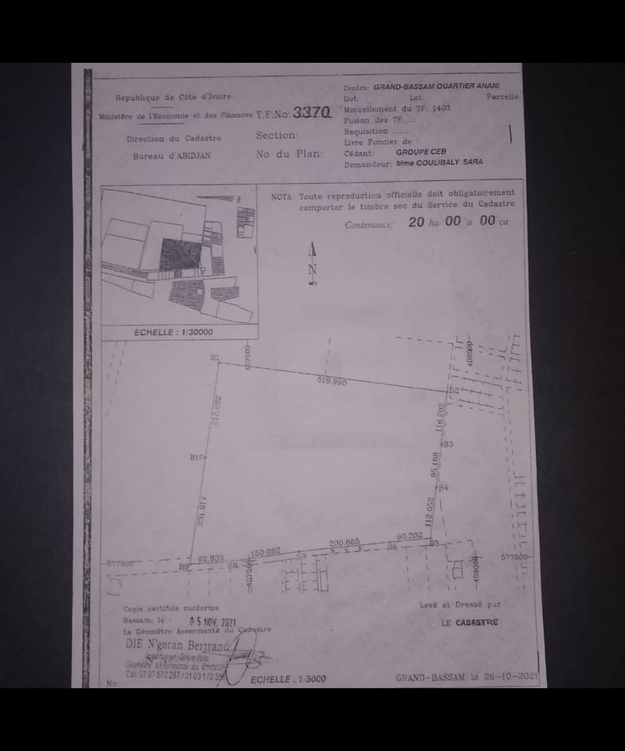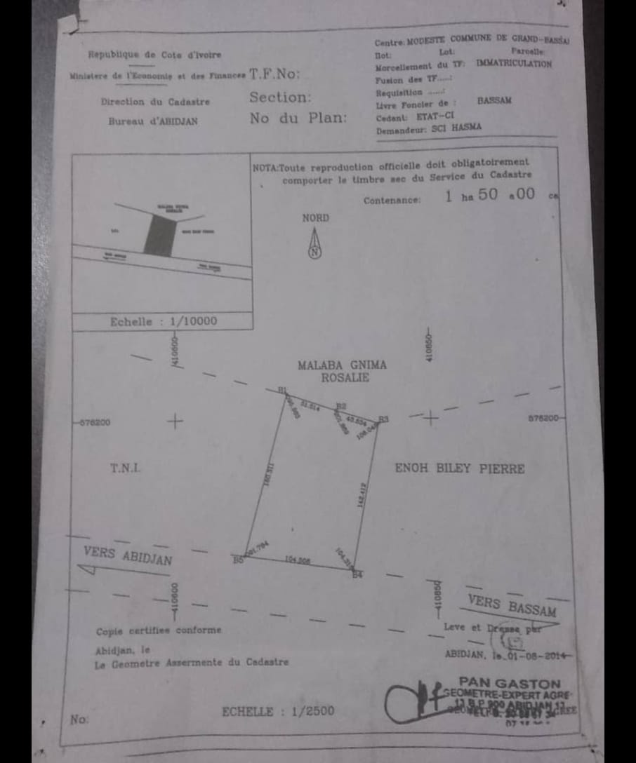 Vente Bassam modeste juste après cité des italiens côté gauche. Une parcelle de 20 ha avec CPF où le propriétaire vend 15 ha dedans à 70.000/m. (Elle garde 5 ha).