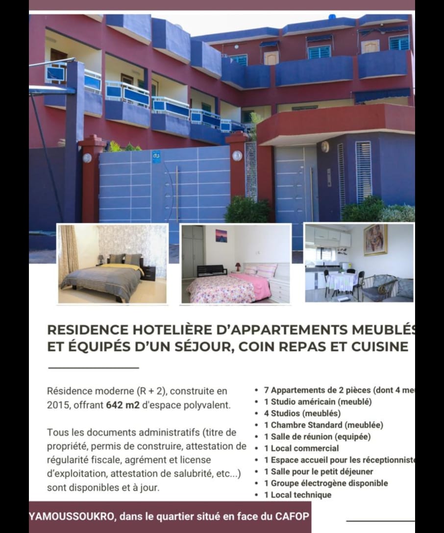 Vente Yamoussoukro hôtel avec 13 chambres varie de studio à deux pièces, bâti sur 642m. Prix 430 millions.